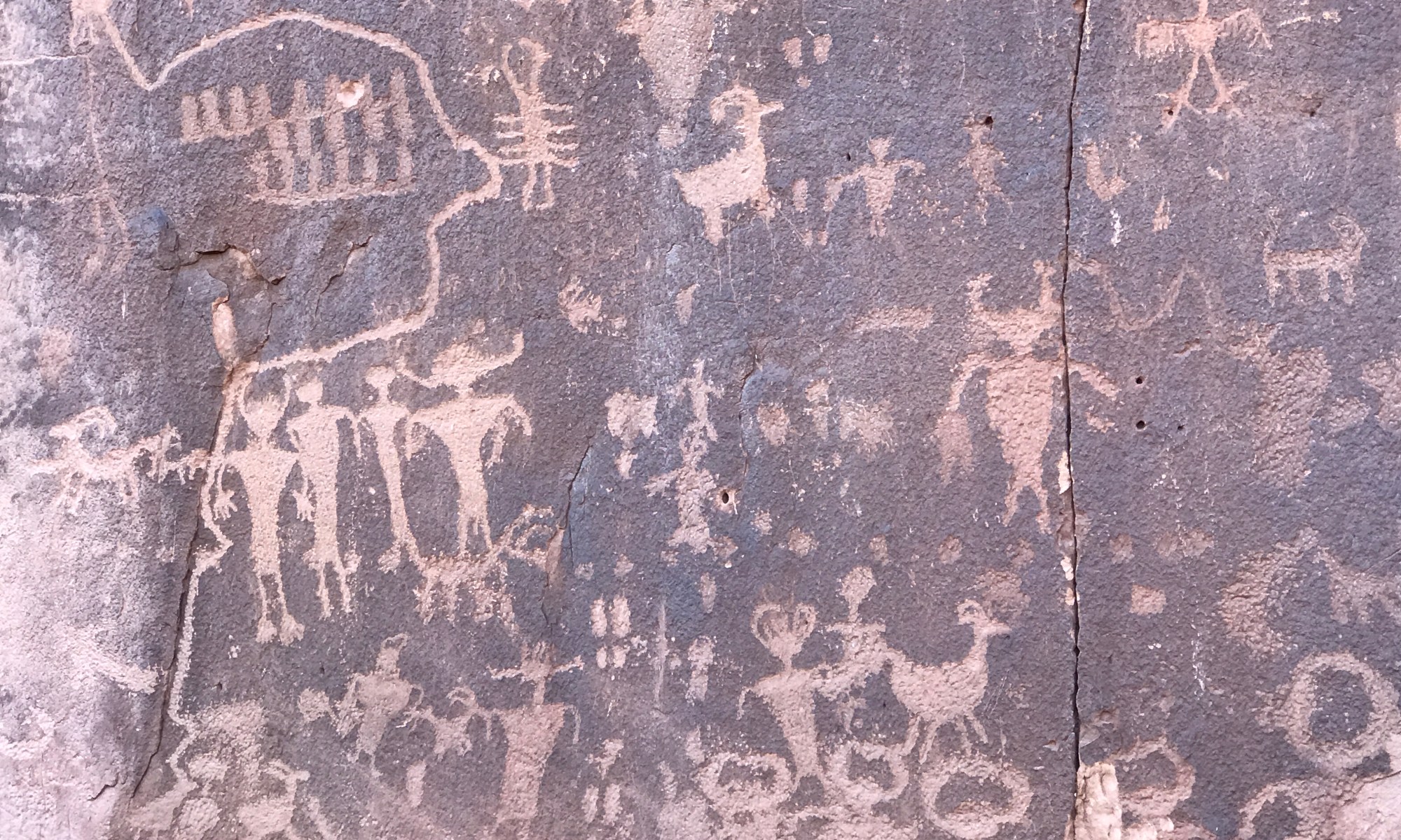 The contrasts are striking between the two parks…Arches seems to embrace visitors — with its many user friendly stopping off viewpoints and helpful information at overlooks. Canyonlands, on the other hand is more aloof…”Look at me,” it says…”but don’t touch.” Reaching its 60 miles of trails and campsites can be daunting…and if you think you’re going to find your way to visit the Horseshoe Canyon Pictographs — left by the hunter/gatherers over 2000 years ago — you’ll have to navigate a 600-foot descent into the canyons of the MAZE District, one of the Park’s most remote wildernesses. As with the Arches, photos do not do justice to Canyonlands.